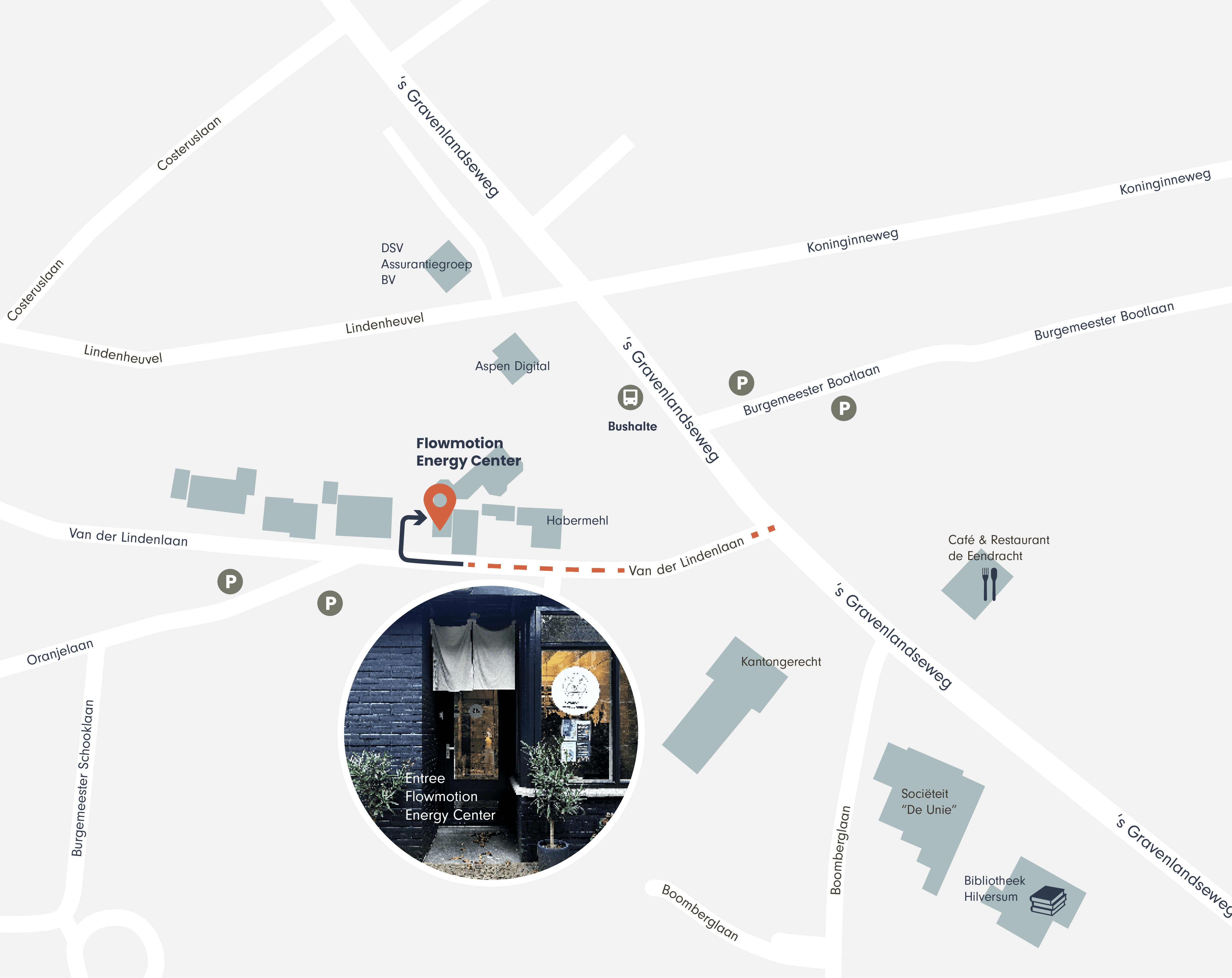 Wanneer je de Van der Lindenlaan inrijdt vanaf de ’s-Gravelandseweg, valt meteen de kantoorvilla op met rode vlaggen op nummer 2. Daarnaast bevindt zich een woonvilla op nummer 2a, gevolgd door een zwarte bungalow op nummer 2b. In het zwarte gebouw, met de ingang aan de zijkant van het pand, bevindt zich het Flowmotion Energy Center.