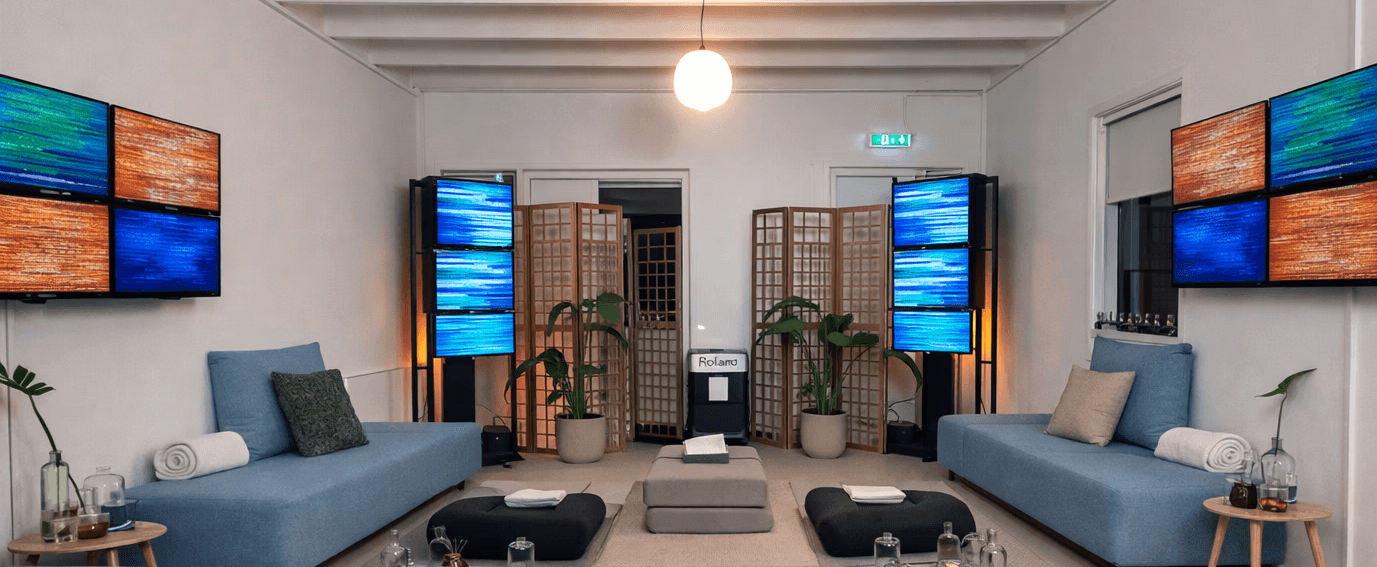 In grotere ruimtes zijn vaak meer units nodig om de kamer helemaal te vullen met energie. Onze ruimte is relatief klein (37 m²). Ze biedt plaats voor tien personen en is ingericht met 24 schermen. Dit is een mooie maar intense verhouding om een krachtig maar prettig gebalanceerd veld te creëren. Hierdoor sluiten de schermen de ruimte als het ware in, wat zorgt voor balans, stabiliteit en een compacte energie-ervaring. Sterk, maar ook zacht en uitnodigend.
